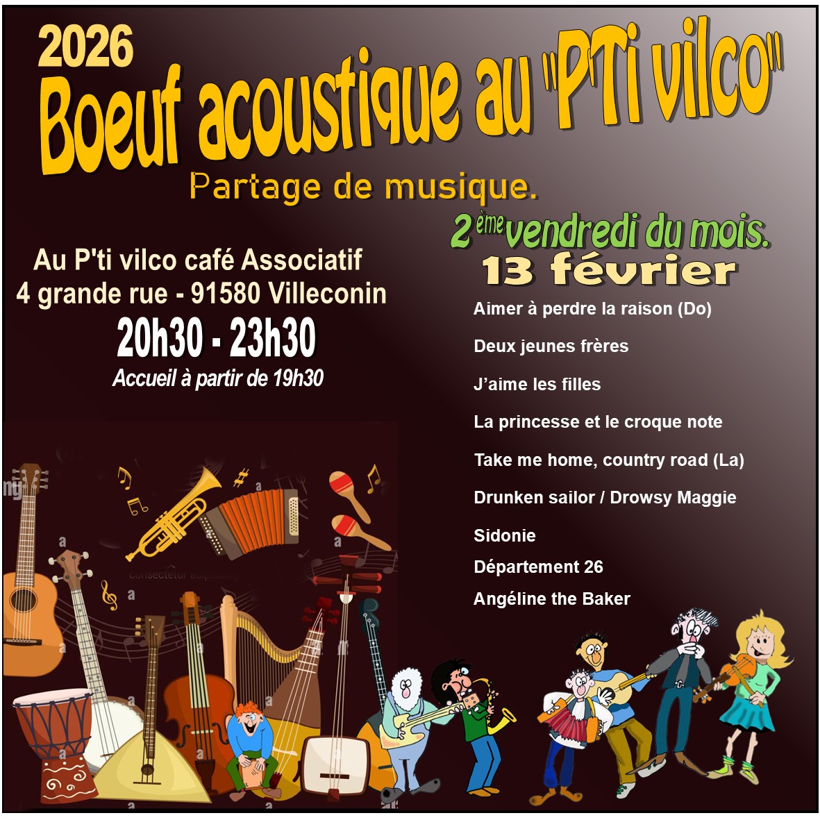 Les « Boeuf acoustiques » 2026 Protest song Graeme Allwright – Hugues auffray Répertoire spécial musique film, séries, Etc… Musique « Spécial Irlande » Repertoire 2026 Répertoire général 2022 – 2023 Partager : Partager sur X(ouvre dans une nouvelle fenêtre) X Partager sur Facebook(ouvre dans une nouvelle fenêtre) Facebook J’aime chargement…